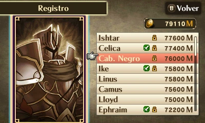 | Spotpass y DLC: | Alm - Altena - Amelia - Arden - Ares - Arthur - Arvis - Ashnard - Athena - Aversa - Ayra - Boey - Brom - Caballero Negro - Camus - Catria - Cecilia - Ced - Celica - Clair - Clive - Dagdar - Deen - Deirdre - Edward - Eirika - Elincia - Eliwood - Emmeryn - Ephraim - Ethlyn - Eyvel - Fee - Finn - Florina - Gangrel - Geoffrey - Gharnef - Hardin - Hector - Etzel - Horace - Ike - Innes - Ishtar - Jaffar - Jamke - Julia - Julius - Karel - Katarina - Larcei - L'Arachel - Legion - Leif - Leonardo - Lewyn - Lilina - Linde - Linus - Lloyd - Lucia - Lugh - Lute - Luthier - Lyn - Lyon - Malice - Mareeta - Marisa - Marth - Matthew - Merric - Mia - Micaiah - Minerva - Mist - Moulder - Mycen - Nabarl - Nanna - Narcian - Nephenee - Nergal - Nino - Nomah - Norne - Nyna - Ogma - Oliver - Olwen - Percival - Petrine - Priam - Quan - Raigh - Lachesis - Raydrik - Roy - Saias - Salem - Sanaki - Scáthach - Selena - Seliph - Sephiran - Serra - Seth - Shanna - Shiida - Sigurd - Sigurn - Sophia - Soren - Sothe - Tiki - Titania - Travant - Ursula - Valbar - Walhart - Wolt - Yen'fay - Zephiel - Zihark | |||||