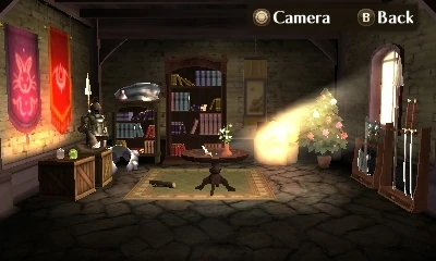 Initially, the square room is bare, save for a small round table in the center and two weapon racks on the right. Both are initially empty. Additionally, there is a small window in the right wall to the rear which allows sunlight and moonlight to enter the room, based on the in-game clock settings. Once recruited, most characters will add something to the room. The following is a list of items brought by characters: