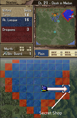 There is a secret shop located in the mountain terrain on the far right side. In the mountains is a lone "plain" terrain tile which leads you to the secret shop if the character is holding a VIP card (Member Card) in their inventory. It is recommended to make the character with the VIP card also hold the Silver Card so the prices of the items sold in the secret shop are halved.