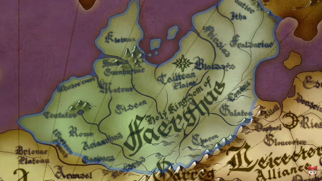 Fódlan is divided into three rival countries and the Church of Seiros, which controls a small, neutral territory in the central Oghma Mountains. While often at odds with each other, they have demonstrated a willingness to cooperate against aggression from countries outside Fódlan.