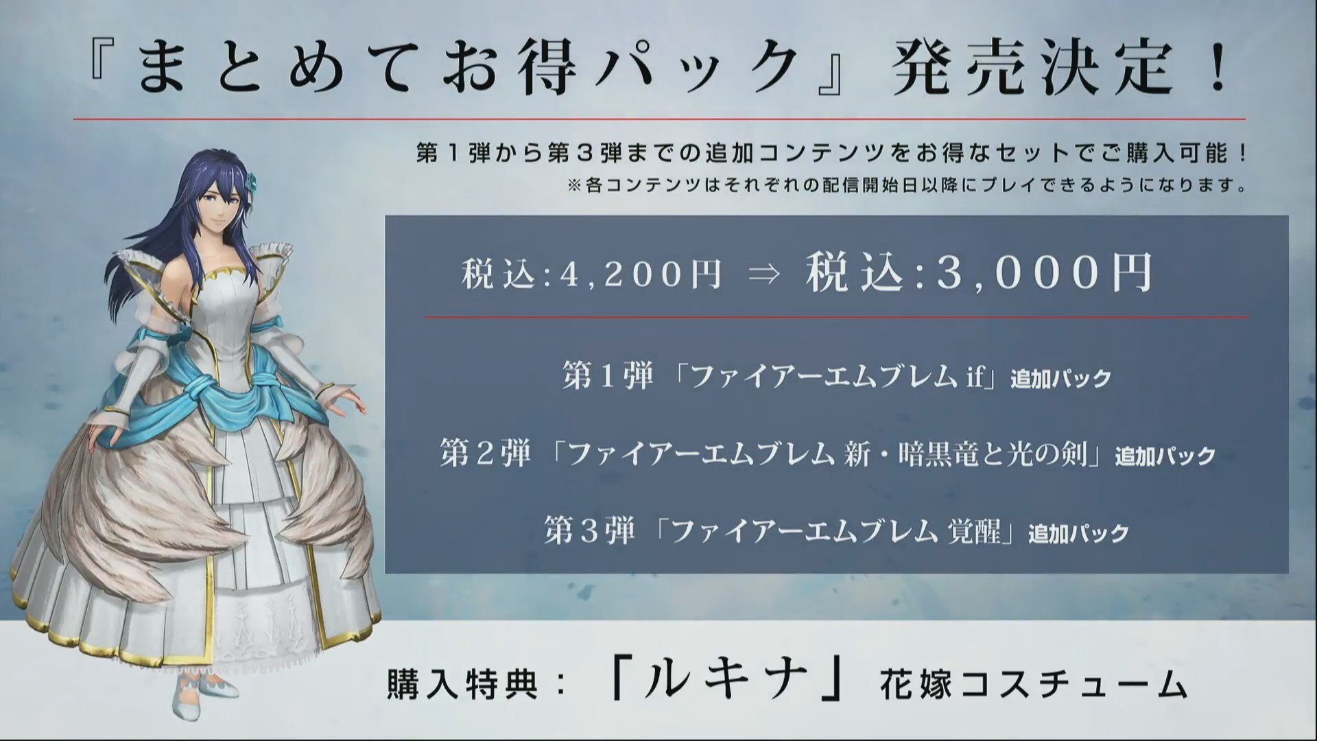 Packs are individually priced at $8.99 US ($11.59 CA) each. All three packs can be bought under a Season pass for $19.99 USD ($25.79 CA) which also rewards the player with a Bride costume for Lucina. Koei Tecmo producer Yosuke Hayashi stated at TGS 2017 that future DLC beyond these packs are a possibility and will depend upon fan feedback.