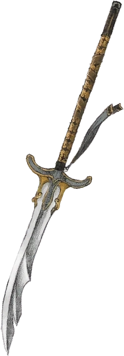 The Laguzslayer is designed to be a sword that possesses a short and serrated blade, with a handle that is nearly as long and features a curved hilt.