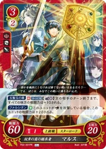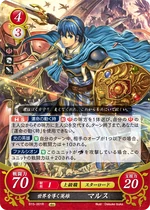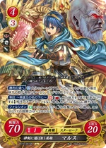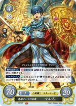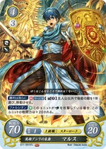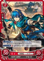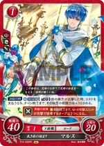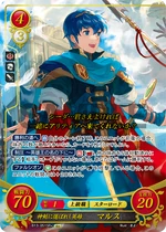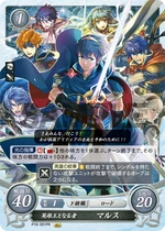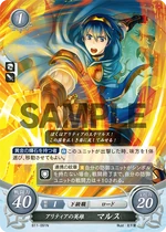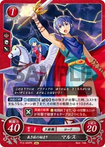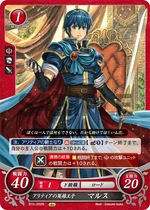 Red cards benefit from playing many Low Cost Units, generally 2 or lower, and the Hero King is no exception. His Series 1 SR has a more powerful Rally when compared to other characters' Rally skills, as Marth's continues into the opponent's turn, and as such is a great defensive tool in case your Rallied Units couldn't kill the opposing Main Character. His Series 4 SR, meanwhile, gives the Marth player a choice to add any Cost 2 or lower Unit that successfully Supports him to your hand on your turn, meaning you can potentially gain more Critical Hit/Evade cards that may save you later on. His Starter Deck exclusive allows you to pull enemy Rearguard Units to the Vanguard whenever a Cost 2 or lower Unit is deployed, giving you an easy way to stop your opponent from hiding all their supportive cards - or even their Main Character - behind cannon fodder. While slightly less powerful, his low Cost cards still bring strength to the table as well. His Cost 2 card gains 10 ATK while you have two or more Red Units Deployed, and his sister Elice's card gives him an additional 10 ATK while she's on the Field, meaning it can be very easy to get a low Cost 70 ATK Unit on the Field when playing a Red Deck. His Series 1 HN card is somewhat lackluster in comparison, but has the ability to move one enemy Unit per turn while he is Deployed to the Vanguard in addition to the Double Orb Breaker Hero's Emblem. His Series 4 N card, meanwhile, has the Emblem of Destiny, allowing you to draw a card and then place a card from your hand on top of your deck, meaning you can avoid self-Supports in battle. It also has an ability allowing you to look at one of your Orb cards, letting you know what to take should your Main Character take a hit in battle. As for his Promo cards, both have the Rapier Skill, giving them an extra 10 ATK when attacking an Armored or Mounted Unit. His Cost 2 Promo allows you to move a Cost 2 or lower Enemy Unit when he is Deployed, while his 3/2 Promo allows you to move any Enemy Unit at the cost of 2 Bonds, making him a useful disruption tool. Overall, Marth, like many Red cards, will benefit greatly from a deck using many Low Cost Units, such as Elice or the Cost 1 Maria Card.