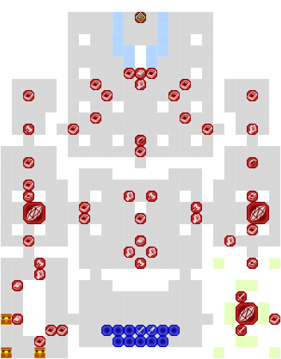 The player has three routes to get to Edelgard either charging the middle, left, or right side of the map. Dividing the army into two to charge the side routes then converging the middle or having all rush one side are solid strategies to effectively split and conquer the sides quickly or combine and conquer the routes slowly, but with more unit options when taking down a side. Regardless of choice of strategy dealing out the nearby starting rooms of the routes on the left and right will provide some chests with useful items on the left while the right has Myson, a powerful mage who is commanding several knights. He is deep in the room, protected by another mage and a Demonic Beast making it difficult to engage safely. He carries Bohr Χ which will reduce your unit's HP to 1 if it hits and can attack any ally unit within 3-10 spaces. He will not move from his starting spot and the spell could be evaded with a character with high enough Speed and Dexterity like a Falcon Knight Ingrid. He can also cast it infinitely so one can only stop his assault with his death. One could also have two characters use their Warp and Rescue spells, respectively, to put an ally who can kill Myson in a single round next to him then immediately withdraw them to safety, sparing some of the risk of leaving an ally alone in the room with the Demonic Beast. Another alternative is using the Retribution gambit to counter Myson (and other enemies with ranged options, except for Edelgard who cannot be countered this way) on a unit outside of other enemies' range and are capable of one-rounding Myson, Quick Riposte is especially useful with this tactic as it guarantees two attacks on enemy phase. Regardless, defeating Myson will cause the units affiliated with Those who Slither in the Dark to disappear from the map, saving the player more trouble later; this means that if one plans to kill Myson it is best done early on with strategies that increase mobility such as Warp, Stride, Canto, Rescue or any combination of these.