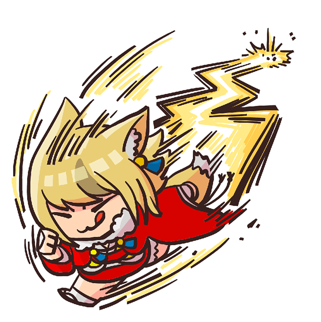 New Foxkit Fang accelerates New Year Selkie's special cooldown and if her Res is higher than her opponent's, she deals up to 70% of the difference between the stat with a maximum 7 bonus true damage per attack. This can ultimately be devastating for enemies who have a huge Res disparity and can mean the difference between them surviving combat against her. Also if her Res is higher than her opponent's, she takes reduced damage during combat and from area-of-effect skills by a percentage based on the difference of the stat x4, maximizing at 40% reduced damage. If she is adjacent to only beast/dragon units or not adjacent to any ally, she transforms, gaining +2 flat Atk and if she initiates combat, she inflicts Atk/Def-4 on her foe and they cannot perform a follow-up attack.