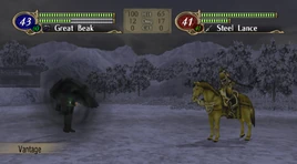 This skill is later integrated into the more advanced skill systems of Fire Emblem: Path of Radiance, where its effect is made more noticeable. However, in Fire Emblem: Radiant Dawn, Vantage becomes dependent on the user's Speed stat, meaning it will not be as consistent in terms of activation.